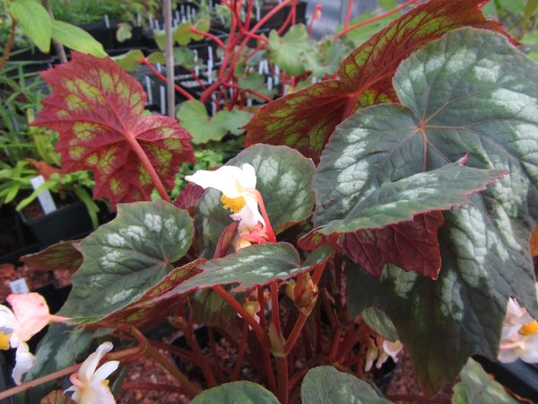 Rhizomatous species from southern China with excellent foliage colored light red on the underside and olive-buff green on top with a ring of silver-white spots just in from the margin. This makes a fine clump to 20" tall in a container, more than holding its own with just foliage but the late season white flowers are welcome frosting on this particular Begonia cake. This has been hardy here in the zone 8 Puget Sound with winter mulch. One of our better collections for sure.