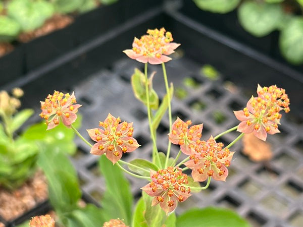 Unit price perA pleasantly architectural plant with upright stems piercing a succession of single leaves topped with a small constellation of flowers, marked by a star-like collection of sepals in which the several inconspicuous-but-charming flowers lie. The overall effect is very sunny and would go great in a meadow-esque setting with fellow Apiaceae members or the like. Not to mention this is one cool customer, hardy down to -35 Fahrenheit, making it cold tolerant anywhere in the continental US!