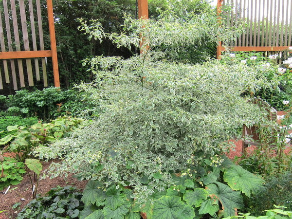 Unit price perVariegated Pagoda Dogwood. A variegated form of this alternate-leafed dogwood that is quite choice and can be seen in our shade garden. This lacks the big bracts of our native dogwood but still has true creamy scented flowers arrayed in flattened disks along the tiered branches. Superb foliage and form and is rock hardy.