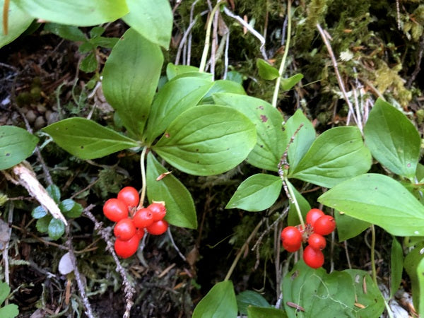 Our native creeping dogwood from seed collected during one of our many hikes in the Olympic Mountains. This deciduous groundcover is such a good plant with obvious white dogwood flowers on 4"-6" stems followed by clusters of red fruit. We like it when it climbs a bit up mossy trunks and logs. Loose soil with a good organic content.