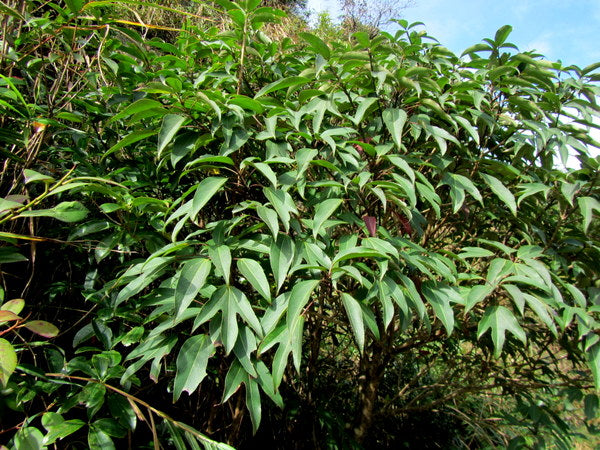 An excellent introduction if you are into the Araliaceae family and fortunately, there are lots of Araliaddicts out there! This came from the high point in its range with occasional cold exposure and has proven hardy outside here in full sun and wind exposure. Not ideal but that's what we got! Our plant in the shade garden declined so some sun at least is good. Plants have variable evergreen foliage with juvenile plants sometimes expressing more frequently deeply 2-clefted 3-lobed leaves with older plants usually completely entire but not always. And this may be influenced by nutrition and exposure as well. Pale green flowers with white anthers in an umbel followed by black fruit. Sorry, can't select by leaf shape.