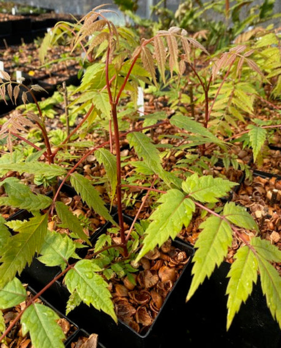 Unit price perOne look at the stalky clumping habit and jagged pinnate leaves of this species and you’d say it was a dead ringer for a Rhus or Aralia. One look at the wafer-like fruits and you’d say dead ringer for an Elm or if you were a real botanical nut Ptelea. Yet like the mighty platypus is neither duck nor otter this is something altogether, a rare member of the maple family improbably enough! In addition to its alluring oddity the winged red fruits held in large clusters of pairs, red blushed petioles, and extremely quick growth make it a not-half-bad ornamental species as well. Virtually unknown in the US but doing well in the UK so at least Zone 8 hardy if not more (there is record of it in Ohio, so Zone 7 is probably a safe bet as well) large shrub to small tree.