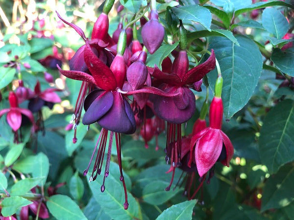 A fine hardy hybrid from Deb and Ron Monnier whose nursery, Monnier's Country Gardens in Woodburn, OR closed in 2009. This knockout will keep the memory alive for years to come. Maroon tube and sepals embrace a corolla that is black velvet eggplant in color with an optical texture that is almost 3D. To 3' and hardy in the PNW. Mulch in winter.