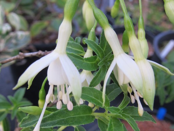 This hardy bush Fuchsia is quite a pleasing addition to the garden where it performs admirably in a sunny spot with lots of narrow hanging white flowers which are touched in faintest green on the tepal tips. Recent winters have put a whupping on reliably hardy plants so if it is going to turn nasty, mulch the base and trunk well. Easy and gratifying.