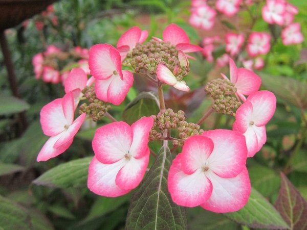 An outstanding selection from Mt Kiyosumi in Japan, this is distinguished by russet and burgundy tones to the new foliage and the lacecap flowers are the perfect complement to that foliage with the sterile florets being white in the center of the flower and blushing into a distinct pink rim. In our shade garden, we have this paired with our collection of Rhododendron falconeri subsp. eximium with its vibrant rusty brown-orange tomentum and both plants play off of one of David Eisenhour's exquisite bronze's which in this case is the seed of a Zulu Daisy. www.eisenhoursculpture.com. The combination has its share of moments of perfection during the growing season.