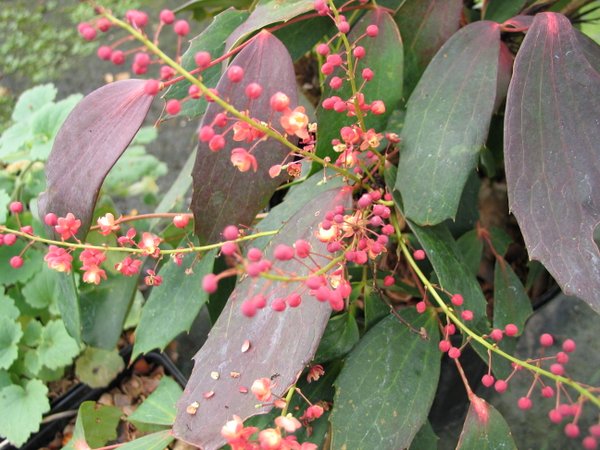 One of the great Mahonia species or Berberis as they are now sometimes known. We saw this growing on Wawushan in Sichuan where it exhibited it's characteristic waxy white underleaf. Loose sprays of pinky-orange flowers in late summer and early fall are followed by nice fruit. Easy and a connoisseurs foliage plant.