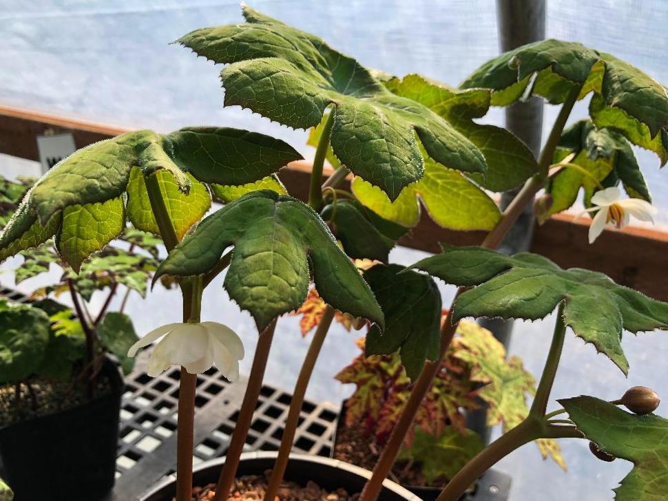 Unit price perPodophyllum or Dysosma – the Asian species are better in Dysosma but when shopping, most people look for Podophyllum when they need to push their shade garden over the top. This Chinese species was shared with us by our friend and great plantsman Darrell Probst who knows an extraordinary plant when he sees it. Among our sea of Podophyllum species and cultivars, this stands apart in habit, form and flower. Upright stems hold green lobed saucers of leaves which cannot be confused with the other green-leafed species. Beautifully displayed are single white flowers under each leaf which when pollinated, morphs into a glowing orange fruit. For us, this species stays in a tight crown without the running habit of some other species. This is good if your space is limited and bad if you want more and of course, we want lots! Which we don’t have but the scant few we do have in surplus, are here.