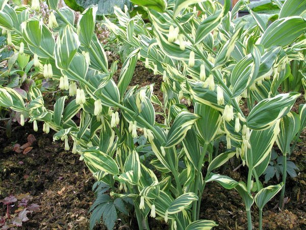 Solomon's Seal. Mighty fine selection and surely one of the very best variegated perennials for shade. Good clean white variegation that illuminates wherever it is planted. Stunning enough to stand alone with a simple groundcover at its feet or schmoozes easily with other garden glitteratti. This doesn't increase overly quickly by any means and a large clump is very prized. Not to be confused with the old standby variegated Solomon's Seal which while nice, doesn't have nearly the degree of variegation as this selection.
