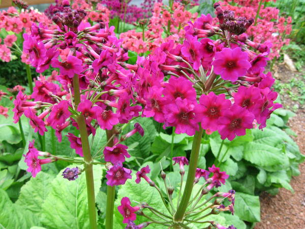 Unit price perCandelabra Primrose. Staggering floral display of tiered rings of flowers arrayed up sturdy stems from 18" to 30" when living large in rich, moist soil and all of this above broadly sumptuous and lightly rumpled foliage. A swash of these always leaves one a bit short of breath with its beauty. Yours will be either vibrant fuchsia or tomato terracotta - a surprise awaits down the line.