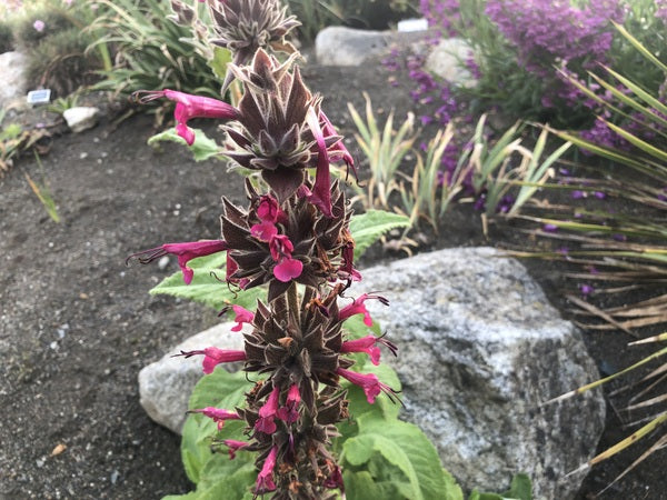 Hummingbird Sage. A California native perennial Sage that can take sun or some dry shade as this will grow under California live oaks. California shade is notably brighter than our Washington shade. This will get 16"-28" tall with rose-pink flowers appearing out of prominent dark calyces and will creep rhizomatously to 4' or so across. Hummingbird banquet and deer proof.