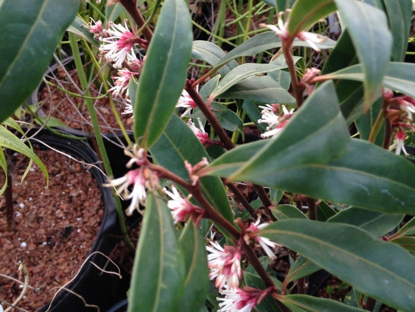 Unit price perPurple Stem Sweet Box, Wonderfully fragrant winter bloomer in December and January whose small white flowers with pink calyces perfume a disproportionate area relative to their size. Narrow alternate evergreen leaves on a plant up to 30" tall but usually shorter. This small evergreen is the same plant offered as var. digyna which has opposite leaves or as var. humilis which is a synonym of var. digyna but the taxonomy shifts like the wind.