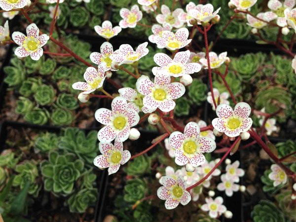Unit price perOne of the many forms of Saxifraga paniculata from the mountains of Europe. We received this with the name of 'Freckles' but find no reference to this name in the various sources where if it were valid, it would be listed. Therefore we assume it is a synonym of 'Punctata' as both refer to the heavy sprinkling of red dot on the petals of the white flowers. Excellent trough or rock garden plant and wouldn't mind a little shade during the hottest blaze of the day although we grow ours in full sun but never let them dry out.