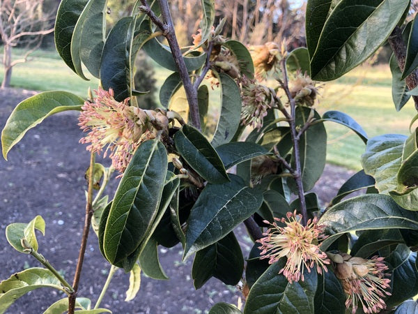 Our collection of this hardy evergreen, Asian Witch Hazel relative. This will become a small tree in time to 20'-30' and can be very useful as screening or a dark backdrop. Here, the Feb-March flowers forego any petal modesty and celebrate their sexual parts on full display. That brings back sadly distant memories. Undamaged by our winters in full exposure. A Far Reaches Botanical Conservancy Offering