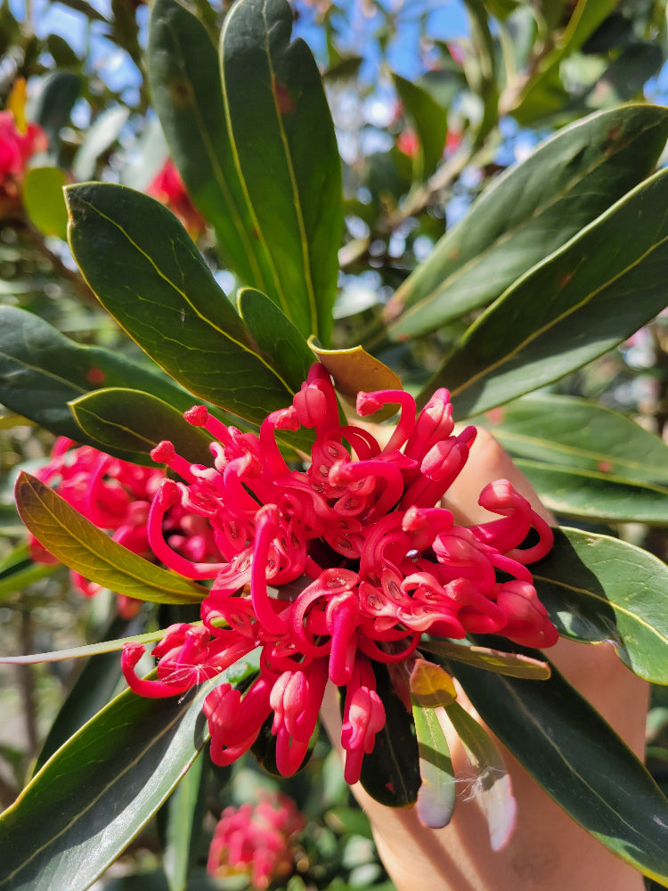 Unit price perWaratah. This evergreen shrub in the Proteaceae hails from Tasmania and is a showstopper. Telopea is from the Greek telopos meaning “seen from afar” which perfectly describes the magnificent clustered red flowers quite unlike anything else we can grow here in the PNW and which are produced at the ends of gently ferruginous and leafy twigs. We were highly reluctant to chance planting out this hard-to-come-by beauty as we were quite sure our winter weather forays into 10F would be a terminal adventure. Were we ever wrong! It has come through the last 6 winters without a whimper and only a few nominal bits of leaf damage from the January 2025 Great Winnowing epic plunge. And deer resistant as if it needs further accolades – we have resolved to never garden without it. Sensitive to higher levels of phosphorous so go low in your NPK ratio. Some shade in hot sun areas.