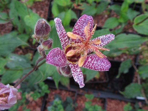 A collection of this vigorous Taiwan Toadie from Dan Hinkley. This is quite rhizomatous making a good clump quickly which is really what you want, as the more sturdy stems clad in darkly spotted leaves holding speckled lavender-pink flowers in late summer, the better, we always say. Light shade and can take a lot of sun if given ample water.