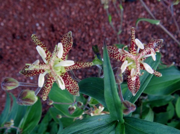 A Toad Lily collected in China by our friend Bill McNamara of Quarry Hill Botanic Garden which is a superior foliage plant with bold black mottled leaves which are especially vivid when in new growth. In bright shade to part sun, this has strong and stiff vertical stems which have mid to late summer buff to amber-brown speckled flowers. Pretty cool and the first of the Tricyrtis to bloom for us and we find the vertical seed capsules which carry through into fall to have a supporting if subtle role in the garden. We saw what we think is the same species growing in a lightly shaded ravine on Leigongshan in China in 2010. Tricyrtis are undergoing a good bit of name revisions recently and Bleddyn Wynn-Jones thought this might be a different species when he visited here in August of 2013 but we saw the same collection at Royal Botanic Garden Edinburgh later in the fall labeled as T. latifolia so there obviously is some taxonomic dust still to settle.
