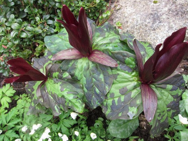 Unit price perSurely one of the finest Trillium species and one of the most fervently desired plant in our shade garden. We've got some fine clumps of this in the garden so it seems a sensible response. This is an uncommon species growing in southern Oregon and Northern California. Dark red sessile flowers with a slight twist of the petals that stand at attention above mottled leaves. These should be planted so there is 2"-3" of soil above the growth tip. Perhaps a bit deeper if you are in a cold zone.