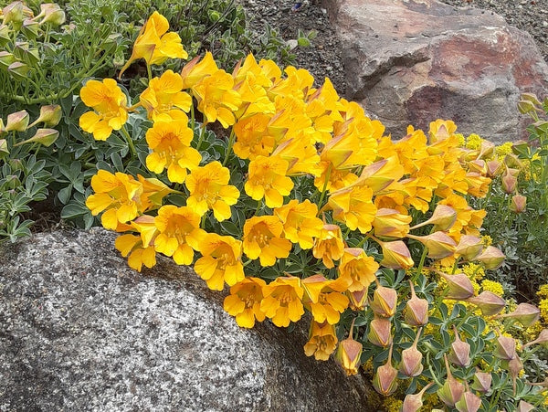 Unit price perThis tuberous Nasturtium species from Chile is quite remarkable and has become a focal feature in our front rock garden until it goes dormant for the year in late July. The blue digitate foliage with up to 7 small leaflets arranged circularly drape and spill until obscured by yellow flowers in June-July. This is adapted to unstable rock slopes deep roots form new tubers. Plant the dormant bulb in well-drained soil deeper than you think, no, deeper than that, still deeper - there you go! A foot or foot and a half gets it done. Propagation is by seed or by tubers with large ones getting cut up like you are planting potatoes.