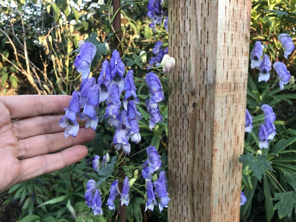 Unit price perThis vining monkshood is from our seed collection of this herbaceous vine which was growing in a large shrub hanging out over a stream in a cold rain. The potential for becoming even wetter was pretty good and fortunately, such a risk proved well worth it as this has large blue flowers with a pale white lip. This has been a star in our shade garden flowering in late August into September. Small tuber capable of growing 10' or more this year given good conditions and something to twine on. Deer resistant.