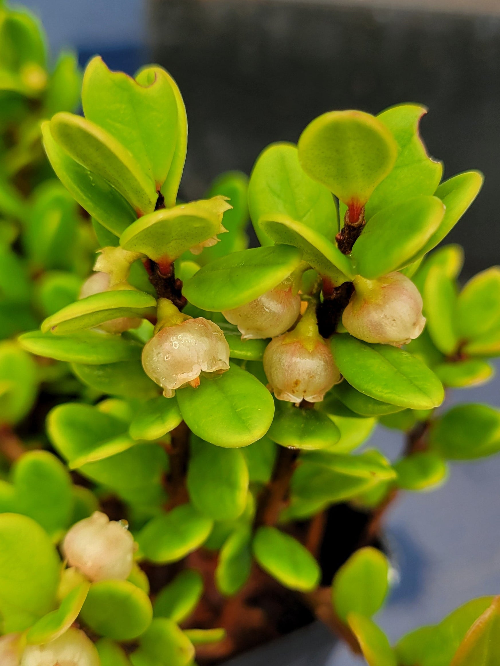 We love this little wild Chinese blueberry so much that we have exhausted all our (and worthy peers') deductive abilities on trying to put a name to it's button-cute face. Alas we must continue putting out sadly desperate ads in the classifieds in hope of a lead that will result in a future rendezvous. In the meantime we will share tales of our infatuation in physical form with you, our loyal listeners. The diminutive size of the overall plant pairs nicely with the relatively large and thick leaves of roughly spoon shape which are some of the most attractive in the genus. The flowers held in the leaf axils are a dead-ringer for the pneumatic tops of jellyfish, semitransparency and all. Epiphytic in the wild and hardiness is just a guess for now but we will let you know when we get a good test on it.