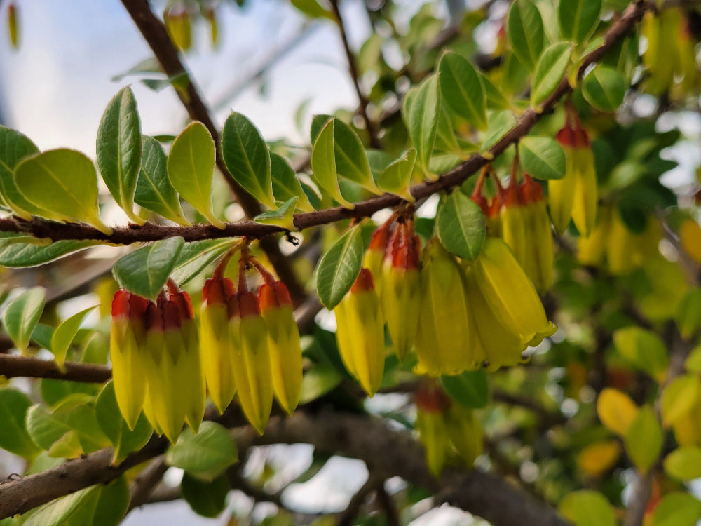 This epiphytic Vaccinium relative - indeed some have merged the two genera - is a stunner. Growing on trees in the cloud forests of the Himalaya, this forms woody lignotubers from which arise the branches clad in evergreen leaves which hold the narrow pendant yellow flowers in late winter and spring. This is an especially good form with red calyces. Tolerant of light frost and needs very good drainage. Our overwintering hummingbirds love this in our greenhouse.
