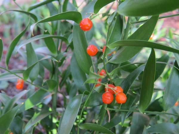 Unit price perPoet's or Alexandrian Laurel. Panache oozes from the phylloclades of this haute shade shrub. Before you get nervous, phylloclades are leaf-like organs of modified stem tissue as this nonpareil evergreen is so far beyond the cutting edge that true leaves are just so yesterday. Small green flowers to delight a microscopist, showy red berries in fall. Imagine wearing this crown of laurel in ancient Greece after winning the marathon. I can visualize the wearing but am having a bit of difficulty focusing on the running part. Now if it was a weeding marathon, I would have to say, let's get it on! These aren't big plants that you will get by any means as they are slow to go but we have gotten the painfully slow beginning out of the way so it is all good from here. You can't go unless you start.