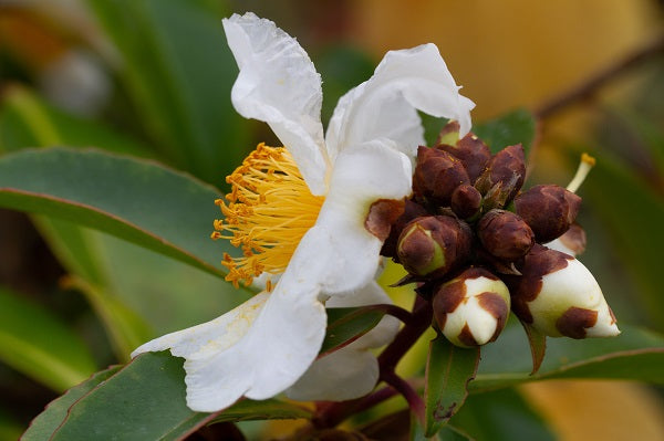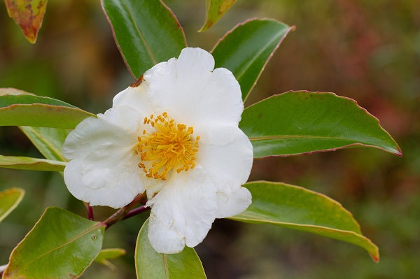Unit price perSecond-generation plants from our original collection of this large shrub to small tree in southern China. Glossy evergreen leaves and large fried egg flowers - white petals with a yolk of yellow stamens - in October-November. A gorgeous plant for mild gardens where frost won't turn the white blooms Camellia brown.