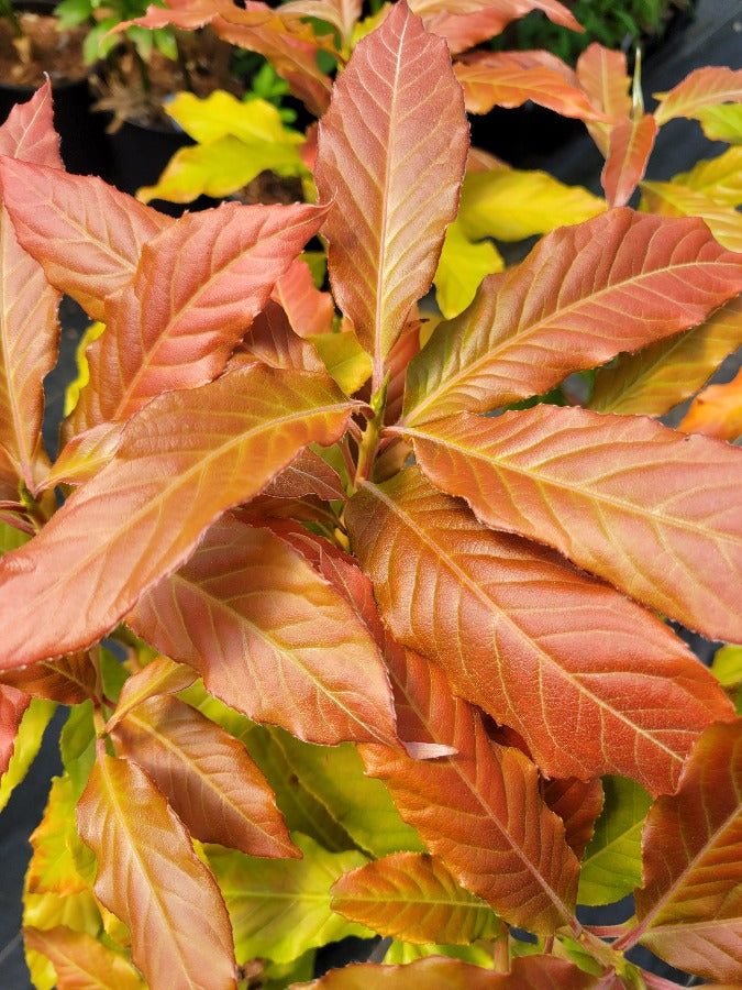 Unit price perA fast-growing collection from the second-tallest mountain in Vietnam. Schima is in the Theaceae or Camellia family and is widespread in Asia. The small white flowers are most attractive and this species has very good foliage. Not seen in flower and hardiness is unknown, typical of new introductions. These were grown from cutting from a plant selected for its excellent red to salmon new growth. A Far Reaches Botanical Conservancy offering. Some species can become towering old-growth trees such as we have seen in southern Yunnan but this was just a youngster at 25'.