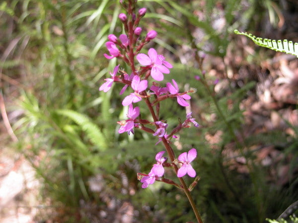 Unit price perGrass Trigger Plant. Gorgeous and fascinating perennial found in Tasmania and Australia. Tidy perfection of evergreen grassy foliage speaks to a refined distillation of Aloe and Agave and the unexpected flamboyant spike of multitudinous pink flowers is over the top. There are sticky hairs under the flowers which can trap gnats and absorb those tasty insect nutrients. The pollination mechanism is fiendish. The stamens are cocked behind the flower and when an insect attempts to feed on the nectar, it trips the trigger, whipping the stamens forward resulting in the pollen-loaded anthers delivering a sucker punch to the insect, showering it with pollen. Can tolerate dry conditions and happiest in good drainage.