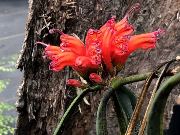 Unit price perStaggeringly good introduction by Jens Nilsen from the China-Myanmar border region. This incomparable Lipstick Vine species is comment-provoking even out of flower with abruptly pendulous branches holding thick, long leaves. The red tubular flowers are the cherry on the Aeschynanthus sundae. Young plants, best in airy well-drained soil for epiphytes.