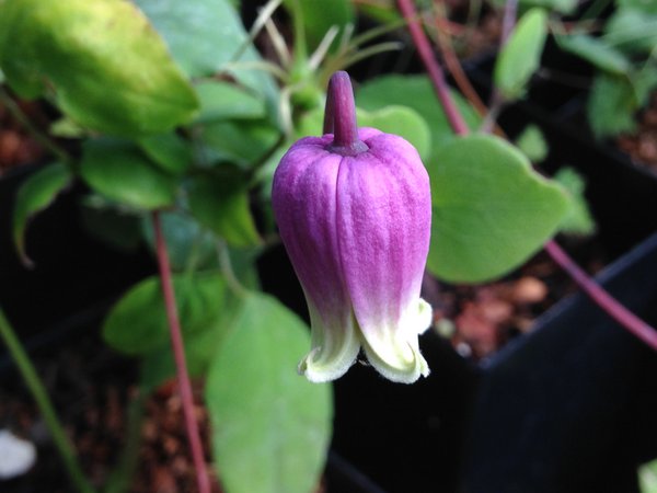 Unit price perLeatherflower Clematis. This infrequently encountered southeastern US native is just a gem. Rambling small vines to 8' at the most with fuchsia-purple closed bells which turn to white at the flared sepal (petal) tips. This blooms in late spring but continues to flower sporadically into fall. Perfect for clambering into shrubs or that small trellis which would get eaten by a Clematis armandii or Wisteria. For those of you to whom provenance matters as much as it does to us, this is a collection from Humphreys County Tennessee. Young sturdy plants which may or may not flower this year but we're thinking they will.