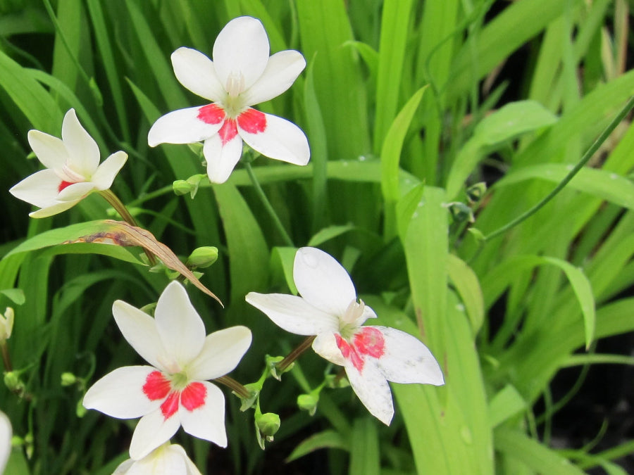 Unit price perThese is one of those elfin whimsies that always elevates my mood whenever I see it blooming. A South African bulb once known as Laperousia this is just a delight, usually red flowered but this selection flowers white with a central red blotch providing a lovely pop of contrast. This survived for years at C. Leo Hitchcocks' garden in Seattle with no care. Will seed a bit if happy and fine with dry soils.