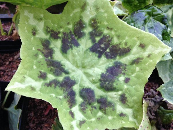 Unit price perThis is very close to 'Kaleidoscope' and comes from the same Japanese nursery from which a plant was purchased and patented in this country as 'Kaleidoscope'. One has to wonder how a plant already in the trade on an international basis can be patented but that is a discussion that can run long into the night. 'Galaxy' is nearly indistinguishable from 'Kaleidoscope' and may well be a sister seedling or another selection in Japan. Lightly hairy stems hold the pale green leaves with their radially symmetrical chocolate splotches. Red flowers held beneath the foliage but who cares, really? It's all about the leaves. Moist shade and be prepared to be envied.